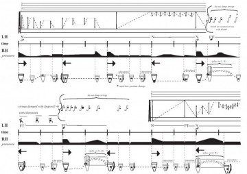 In contrast to traditional cluster notation, black shapes do not denote unified gestures. Szmytka: “I often have to instruct my musicians not to equate their bodies with categories and parameters. When I place my hand on the keyboard, I want it to keep its natural shape. My hand is not a ruler, which is why one key (below the wrist) will be pressed harder than another (under the bend). The shape of the hand leaves an acoustic trace. It’s certainly not going to be a even-sounding cluster.”